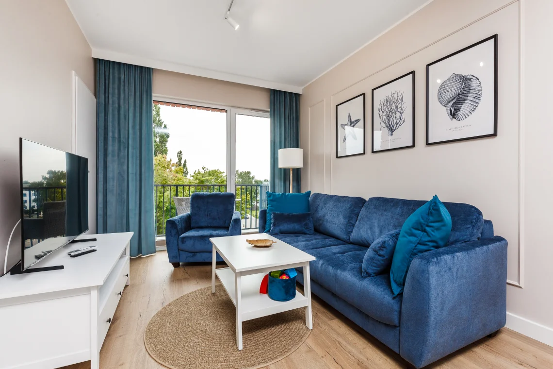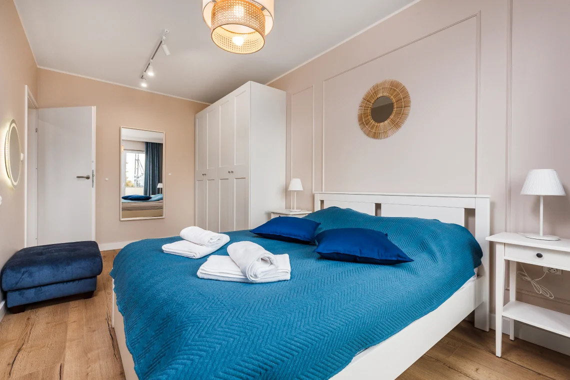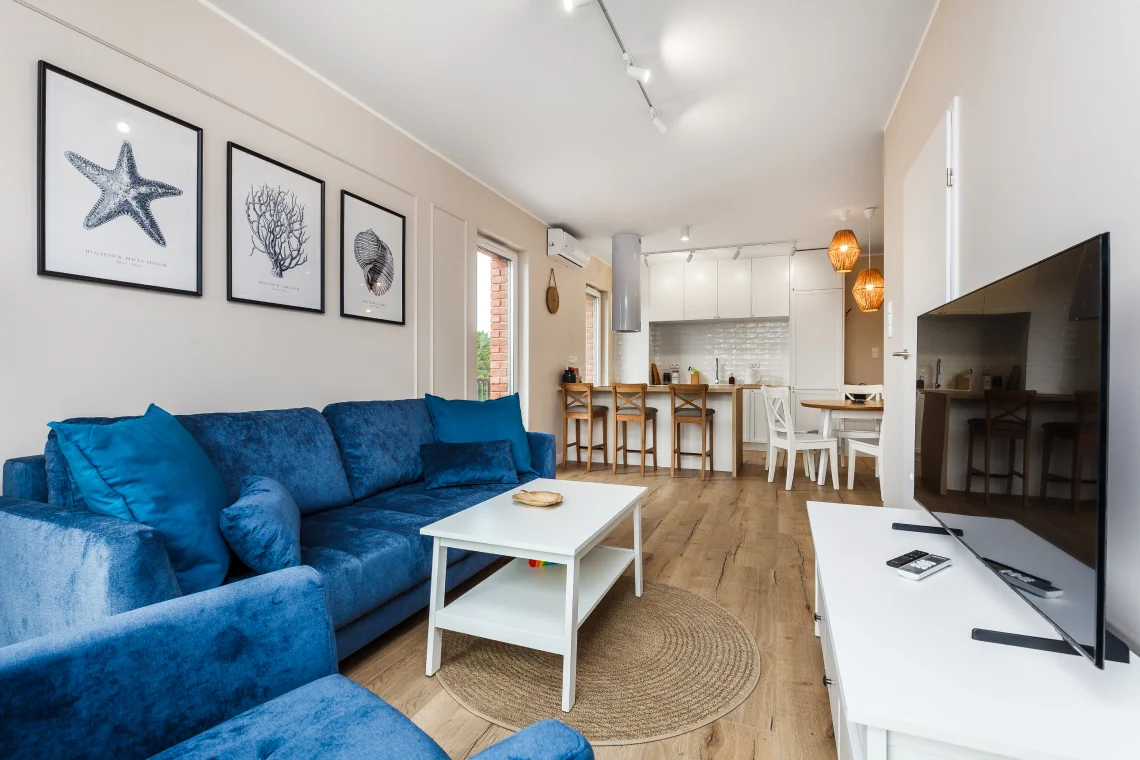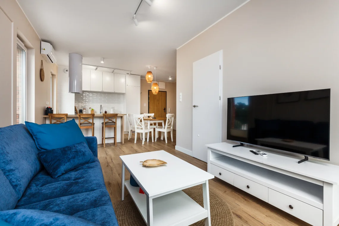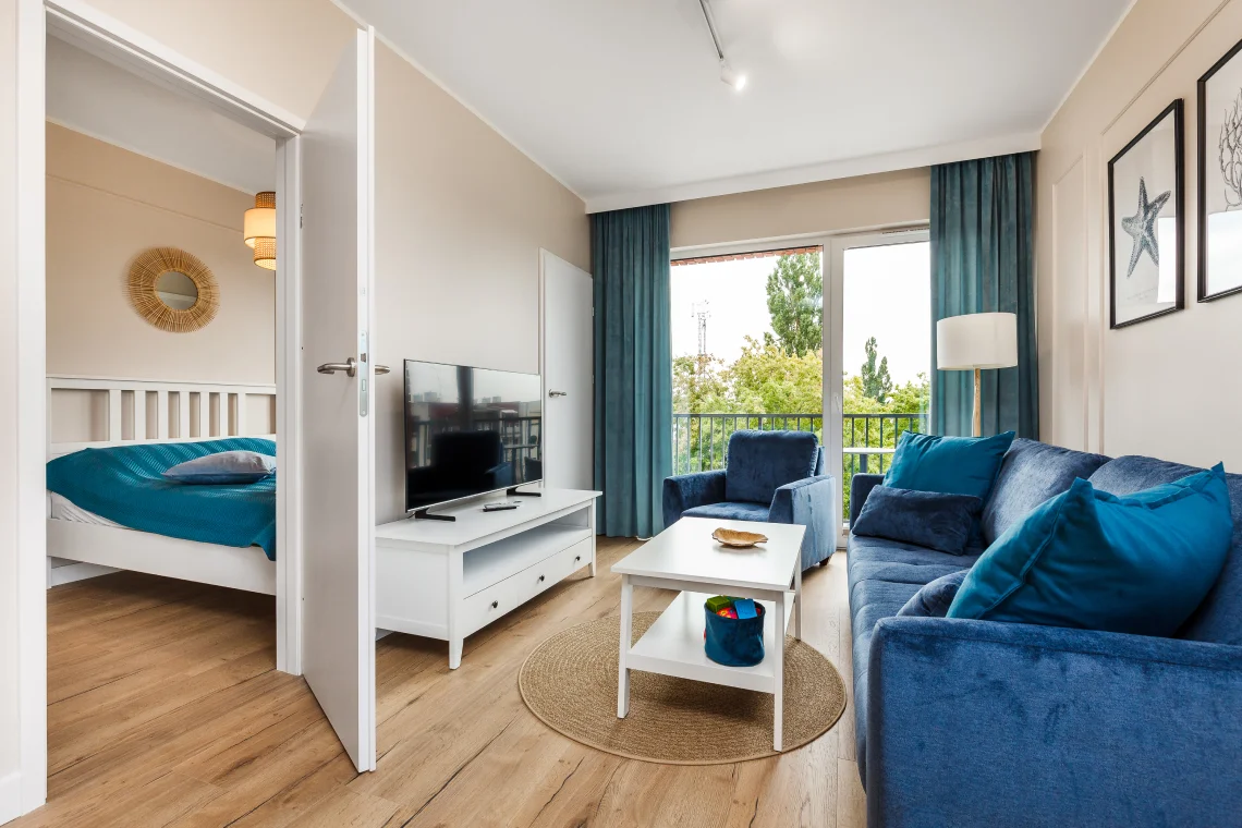 Nowoczesny apartament 6-osobowy o powierzchni 65 m², posiada dwie sypialnie i salon z aneksem kuchennym.