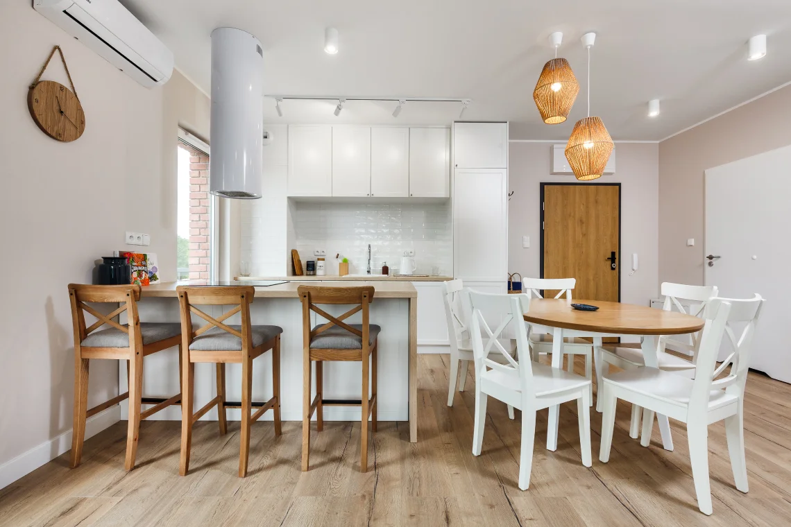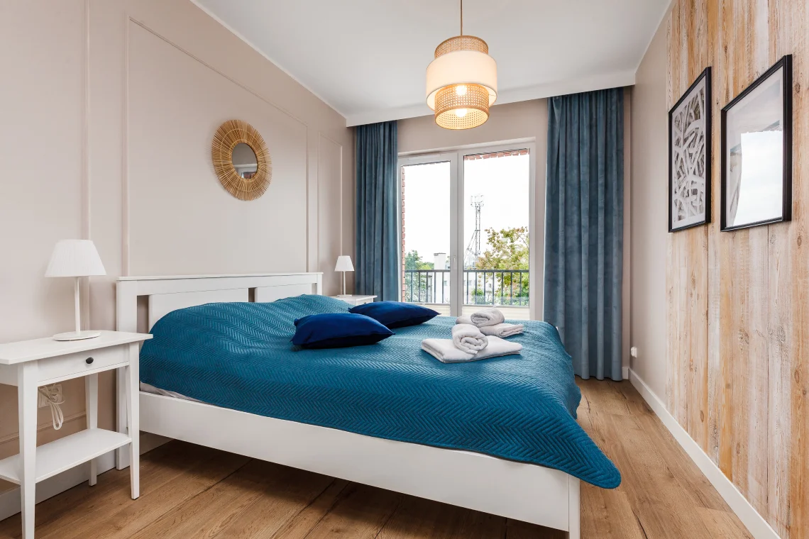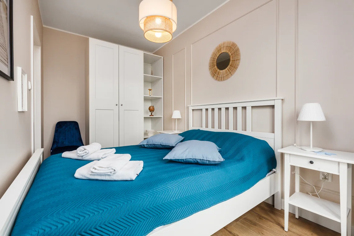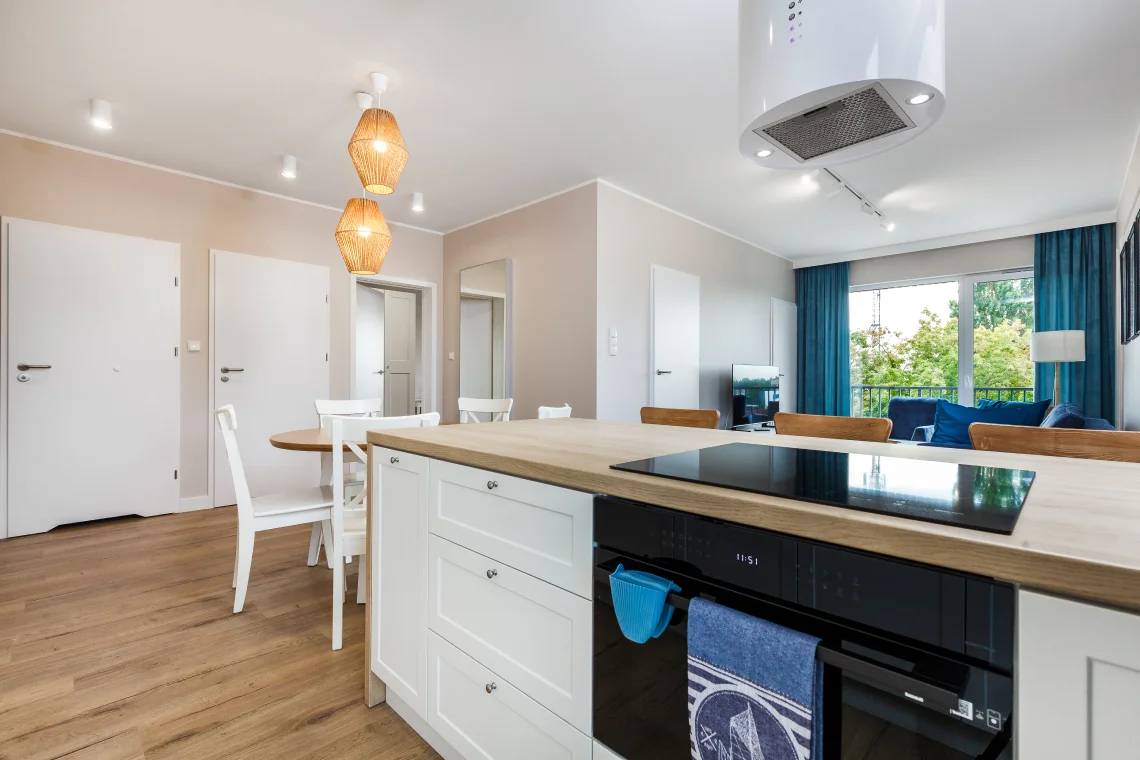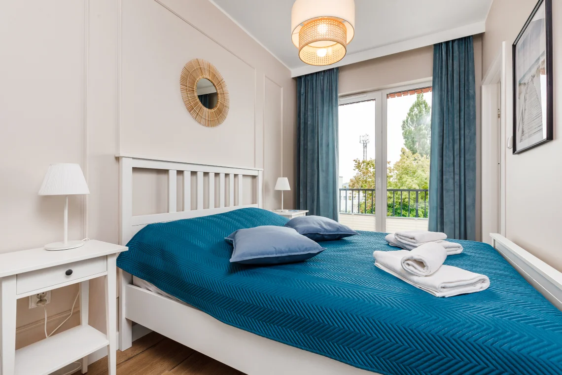 Nowoczesny apartament 6-osobowy o powierzchni 65 m², posiada dwie sypialnie i salon z aneksem kuchennym.